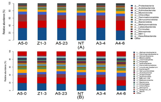 The alpha diversity analysis was used to reflect the richness and diversity of rhizosphere bacteria. The Chao1 indexes in NT poplars had highly similar results in CM varieties, including A5-23, Z1-3, and A3-4. At the same time, the Cry1Ah1 expression might increase the community richness of rhizosphere bacteria, for which the analysis of Chao1 showed no dominant difference between NT and CM varieties (Figure 3A and Table S4). Moreover, the observed species in NT poplars had no dominant differences compared with CM varieties, except for line A4-6 (Figure 3B and Table S4). The PD whole tree in NT and CM varieties shared similar features with the observed species (Figure 3C and Table S4). There are no significant differences in the analysis of the Shannon curves (Figure 3C,D and Table S4), which suggests that the community diversity of rhizosphere bacteria was similar between NT and CM varieties. Based on the alpha diversity, we concluded that Cry1Ah1 expression slightly influences the rhizosphere bacterial richness, but does not affect the community diversity of rhizosphere bacteria.