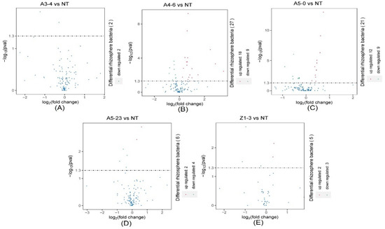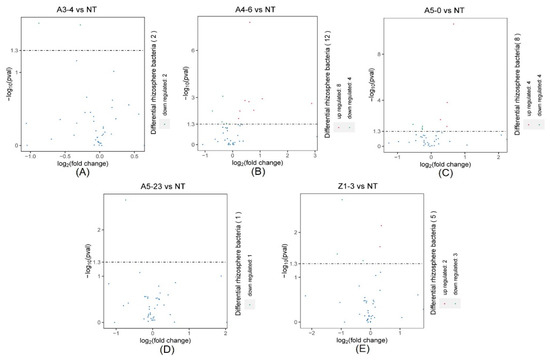 The DeSeq2 analysis for the selection of statistically differential rhizosphere bacteria at a class level between NT and lines A3-4 (A), A4-6 (B), A5-0 (C), A5-23 (D), and Z1-3 (E).
