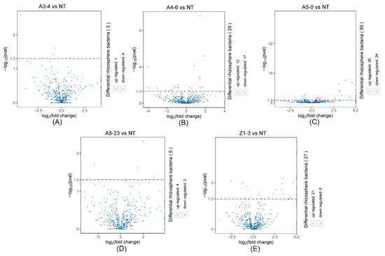 The DeSeq2 analysis for the selection of statistically differential rhizosphere bacteria at the phylum level between NT and lines A3-4 (A), A4-6 (B), A5-0 (C), A5-23 (D), and Z1-3 (E).