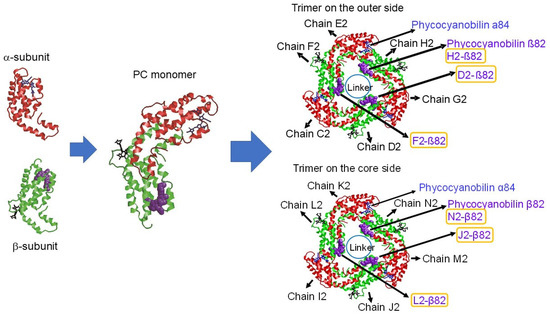 Schematic representation of α- and β-subunits, the phycocyanin (PC) monomer, and two PC trimers of the red alga Porphyridium purpureum phycobilisome (PBS). Proteins are depicted using cartoon representation. The chromophore bound to the 84th amino acid in the α-subunit (α84), the chromophore bound to the 82nd amino acid in the β-subunit (β82), and the chromophore bound to the 153th amino acid in the β-subunit (β153) are depicted using blue stick, purple spacefill, and black stick representations, respectively. The corresponding Protein Data Bank (PDB) ID for the structure is 6KGX.