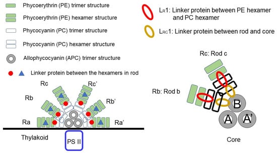 Phycobilisome (PBS) is a large peripheral light-harvesting protein complex present on the cytoplasmic side of the thylakoid membrane in cyanobacteria and red algae [1,2,3,4,5]. PBS is typically hemidiscoidal in shape, with three cylindrical cores and six rods radiating from the core. Their cylindrical cores and rods are composed of phycobiliproteins and linker proteins, which bind chromophores. The light energy absorbed by chromophores in the peripheral rods can be funneled to the core via chromophores at very high efficiency [5]. This molecular mechanism of excitation energy transfer within PBS is an example of a higher and unique function in a living organism. However, the mechanism underlying the high efficiency is unclear, although the vibronic treatment of chromophores in recent studies [6,7,8,9] might lead to the resolution of this mechanism.