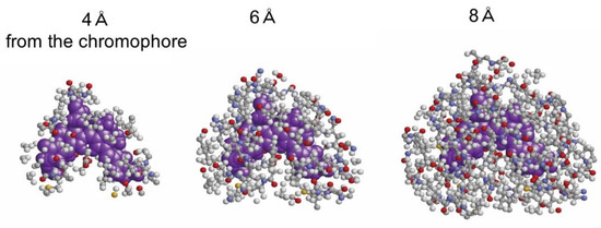 The chromophore geometry in the phycobilisome (PBS) is the chief factor that determines its electronic state. The second factor is the protonation of the chromophore [14,15,16,17,18,19,20], and the third is the electrical interaction in the environment. In this study, the electrical effect of the environment, consisting of 12 phycocyanin (PC) chains and two linkers LR1 and LRC1, is considered the function of the distance from the chromophore when the electronic state of each chromophore and the absorption wavelength λ1 of the S0 → S1 transition are calculated. Figure 3 shows the atoms of the environment within 4, 6, or 8 Å from β82 in F2, which is the original chain ID in [11].