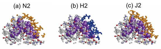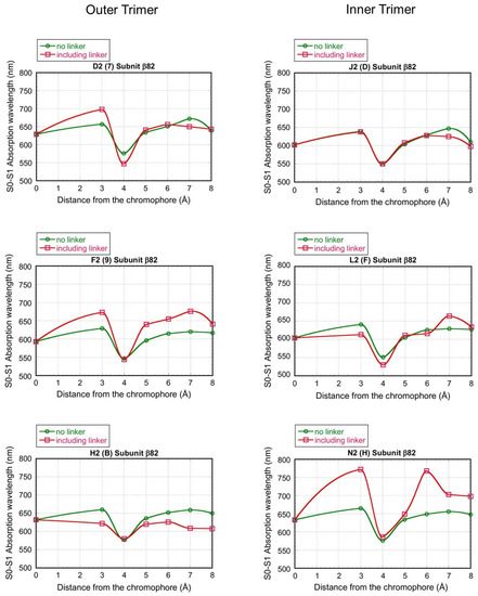 Figure 7 shows the effect of the surroundings within 6 Å from β82 on the absorption maximum wavelength of the β82 of the N2 chain, the H2 chain, and the J2 chain in the following three cases: (1) when only PC atoms within 6 Å are considered, (2) when all PC and linker atoms within 6 Å are considered, and (3) when only linker atoms within 6 Å are considered.