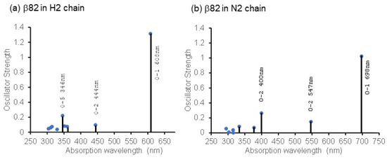Optical absorptions of β82 chromophores in the H2 chain and the N2 chain. The vertical axis represents oscillator strength, and the horizontal axis represents absorption wavelength.