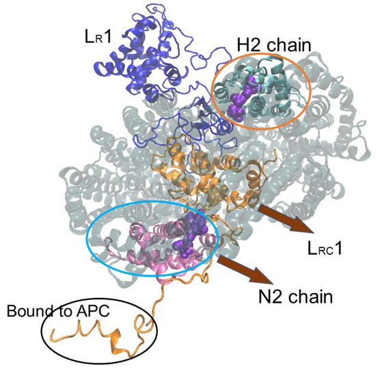 The location of the N2 chain, the H2 chain, LR1, and LRC1 in and around the phycocyanin (PC) hexamer. The N2 chain, the H2 chain, LR1, and LRC1 are shown in mauve, cyan, blue, and orange, respectively. The β82s in the H2 and N2 chains are depicted by a purple spacefill representation. The other four chains in the PC hexamer are shaded in gray. The terminal end of LRC1 binds to the core protein allophycocyanin (APC).