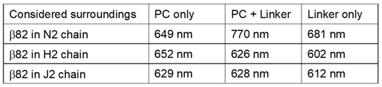 In this study, the factors that promote the redshift and blueshift of the chromophore β82 should also be noted. If the geometric structure of phycocyanobilin is the same as the β82 of the PC hexamer of red alga Porphyridium purpureum, phycocyanobilin can be redshifted or blueshifted by applying the same electrical influence as these linkers. Information on the linkers around β82 is useful when considering the physical properties of the chromophore phycocyanobilin. In particular, the influence from the surroundings within 6 Å from the β82 of the N2 chain showed a very large redshift (see Figure 4).
