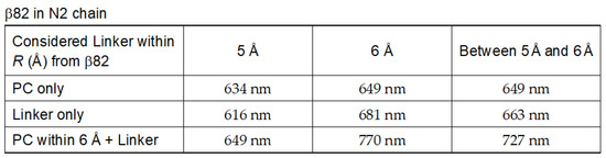 When both the PC protein portion within 6 Å from β82 and the linker from 5 Å up to 6 Å from β82 are considered, β82 has a wavelength of 727 nm and shows a larger redshift than Result (i). When both the PC protein portion within 6 Å from β82 and the linker within 6 Å from β82 are considered, β82 has a wavelength of 770 nm and shows a larger redshift than Result (ii).