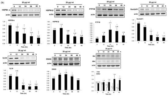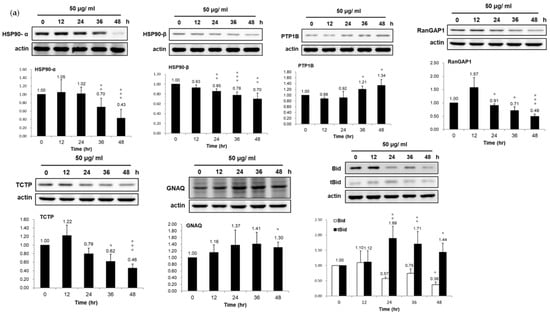 Among the PEPE2-induced deregulated proteins, heat shock protein (HSP) 90-α, HSP 90-β, protein-tyrosine phosphatase 1B (PTP1B), Ran GTPase-activating protein 1 (RanGAP1), human translationally controlled tumor protein (TCPT), Guanine nucleotide-binding protein G(q) subunit α (GNAQ), and Bid were chosen to validate our observation on the proteomics results using western immunoblotting. These seven proteins were targeted attributable to their respective high-fold changes and likely linked to cell proliferation and apoptosis. In line with the proteomics results, the data of western immunoblotting demonstrated that HSP 90-α, HSP 90-β, RanGAP1, TCTP, and Bid were under-expressed while PTP1B and GNAQ were over-expressed, respectively, in the PEPE2-treated T24 and J82 cells (Figure 2). Meanwhile, corresponding to the downregulation of Bid, the active form of t-Bid was up-regulated in PEPE2-incubated T24 and J82 cells, which can evoke apoptosis.