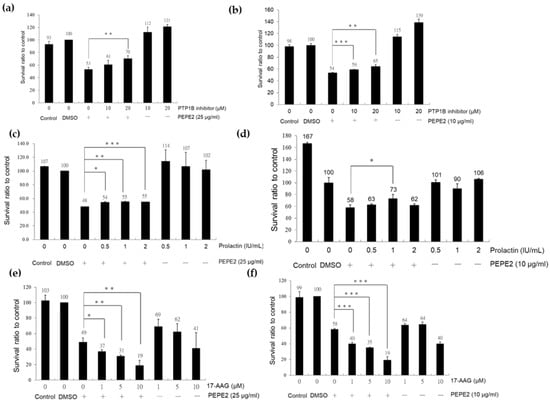 To further confirm the involvement of PTP1B and HSP90 in PEPE2-evoked apoptosis, we investigated the impacts of PTP1B inhibitor, prolactin (an HSP90 agonist), and 17-327 allylamino-17-demethoxygeldanamycin (17-AAG) (an HSP90 inhibitor) on PEPE2-exposed J82 and T24 cells. The J82 and T24 cells’ survival was restored with the increment amount of PTP1B inhibitor under the influence of PEPE2, while the PTP1B inhibitor alone did not affect the cell survival (Figure 3a,b). The prolactin treatment minorly ameliorated the T24 and J82 cells’ existence in the presence of PEPE2 (Figure 3c,d). On the other end, the coincubation of 17-AAG and PEPE2 provoked much stronger apoptotic effects than 17-AAG alone (Figure 3e,f). The above observation implicated that PTP1B and HSP90 were undoubtedly associated with the apoptotic process evoked by PEPE2.