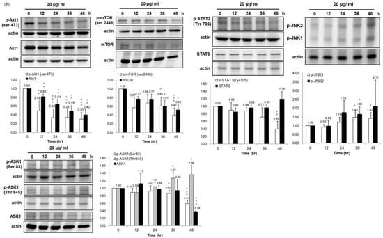 Hsp90 is an essential chaperon for conformational integrity and the activities of some oncogenic transcription factors and signaling effector proteins [17], such as protein kinases (Akt and Erk), signal transducer, and activator of transcription-3 (STAT3), epidermal growth factor receptor (EGFR), and insulin-like growth factor receptor (IGF-R), hypoxia-inducible-factor-1α (HIF-1α). Also, IPA indicated that HSP90 participates in the STAT pathway. Thus, we examined the influences of PEPE2 on the expression of client proteins of HSP90 and the Akt/mTOR/STAT3 pathway. Our data presented that PEPE2 incubation profoundly inhibited Akt-1 phosphorylation in the T24 and J82 cells, while the treatment barely affected the Akt-1 expression (Figure 4). Following the Akt-1 results, PEPE2′s presence meaningfully curbed mTOR phosphorylation and profoundly decreased the phosphorylated STAT3 (active form) expression with no effect on STAT3 expression in the T24 and J82 cells. STAT3 is one of the client proteins of mTOR [18]. The reduced p-STAT3 amount was possibly attributable to overexpressed PTP1B (Figure 4). Surprisingly, PEPE2 treatment significantly inhibited mTOR synthesis in T24 cells at a 48-h duration. However, the treatment dwindled mTOR expression in J82 cells at every duration, especially at the 36- and 48-h periods. In addition to Akt-1, HSP90 phosphorylates ASK-1 at ser83 via Akt-1 and inhibits Ask-evoked apoptosis [19]. Figure 4 demonstrated that ser83 phosphorylation of Ask-1 decreased due to reduced HSP90 expression provoked by PEPE2 administration in the T24 and J82 cells, which initiated apoptosis. In contrast, Thr845 phosphorylation of ASK-1 induces p53-mediated apoptosis [20]. Our results indicated that PEPE2 incubation triggered the increment of Thr845 phosphorylation of ASK-1. In addition, Wang et al. reported that HSP90 inhibition decreases pSer83 but increases pThr845 and p38/JNK activation. Consistent with Wang’s observation, PEPE2 therapy could upregulate the phosphorylated JNK expression in T24 and J82 cells. The earlier findings implicated that PEPE2 might evoke apoptosis by regulating the HSP90/Akt/ASK-1/JNK pathway in bladder cancer cells.