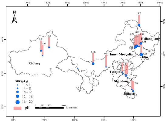 At present, domestic research on soil organic carbon in saline-alkali land are mainly concentrated in Xinjiang, Inner Mongolia, Heilongjiang, Jilin, Tianjin, Shandong and Jiangsu Province. The vegetation types included alpine meadow, plain desert grassland, mountain meadow grassland and mountain grassland. The soil types included chestnut soil, grey desert soil, black soil, chernozem soil and soda saline-alkali soil (Figure 1). Heilongjiang Province and Jilin Province had the highest soil salt and alkali content, with a pH range of 8.84–9.94, and the highest SOC content (3.05–17.8 g/kg).