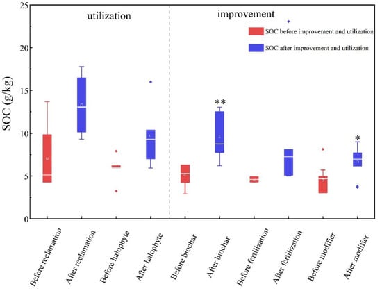 Changes of SOC content in saline-alkali soil after utilization and improvement. Significance: ** p < 0.01, * p < 0.05.
