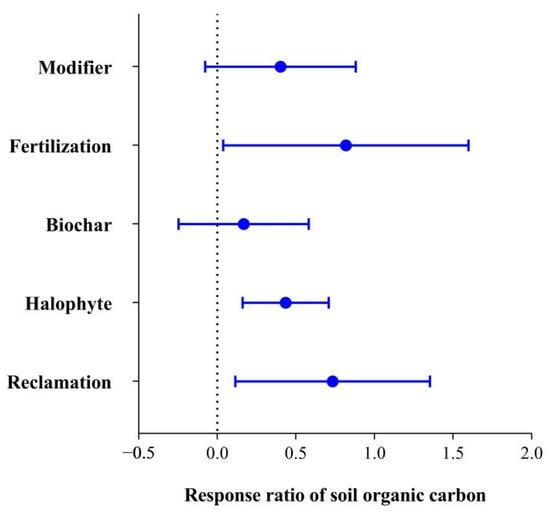 The SOC of saline-alkali land after reclamation, planting halophytes and fertilization increased, but it did not change significantly compared with that before improvement and utilization (p > 0.05). SOC in saline-alkali soil increased significantly after biochar and modifier application (Figure 2). The content of SOC in saline-alkali soil was 2.9–6.3 g/kg before biochar application, and it significantly increased to 6.2–13.05 g/kg after biochar application (p < 0.01). The SOC content was 3.05–8.12 g/kg before the application of the modifier, and significantly increased to 3.68–9 g/kg (p < 0.05) after the application of the modifier (Figure 2). The 95% confidence interval of the response ratio (RR) of SOC ranged from 0.48–0.98, 0.5–1.13, 0.32–0.55, 0.21–059 and 0.001–0.33 for reclamation, fertilization, halophyte planting, modifier and biochar, respectively, indicating there was a positively significant (p < 0.05) impact on SOC (Figure 3).