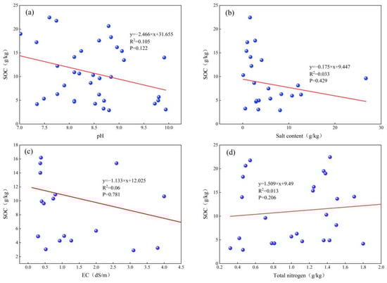 On a large scale, SOC in saline-alkali land was negatively correlated with pH, salt content and electrical conductivity (EC), and positively correlated with total nitrogen (TN), but the correlation was not significant (p > 0.05, Figure 4).