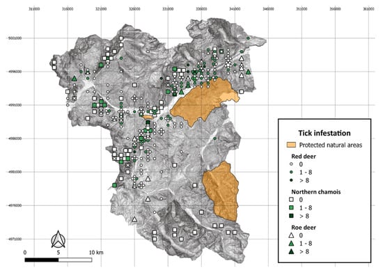 Increasing interactions at the human–animal–environment interface are associated with the occurrence of emerging infectious diseases [1]. Wildlife, in particular, historically played a major role as a source or reservoir of several emerging diseases threatening both animal and human health [2]. This fact has enabled the use of wildlife as sentinels of emerging health threats, including tick-borne diseases. Passive surveillance activities on wildlife, for instance, allowed detection of the Crimean-Congo haemorrhagic fever virus emergence in ticks engorged on red deer in Spain [3], and tick-borne encephalitis virus (TBEV) in ticks and roe deer in the Netherlands and the United Kingdom [4,5] prior to the occurrence of human cases [6,7,8]. Moreover, wildlife can provide data about the potential geographic distribution of tick vectors and transmitted pathogens.