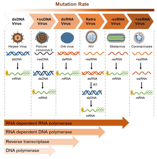 Virus mutation rates vary depending on the polymerase fidelity from high-fidelity DNA polymerases that possess proofreading activity. Mutation in RNA viruses also depends on genome size, with lethal mutations higher in larger RNA genomes. The mutation rate of DNA viruses varies depending on polymerase error, host reaction, and viral error-correction enzymes. Some small DNA viruses do not contain DNA polymerase and use host polymerases for proofreading [150]. Importantly, RNA-dependent RNA and DNA polymerases make more errors, leading to more mutations than DNA polymerases due to a lack of proofreading activity (Figure 3).