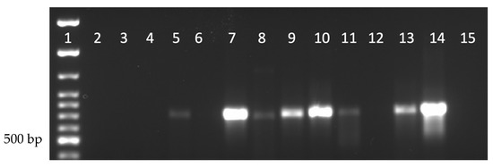 Nora virus presence within laboratory-reared insects. Lane 1: 100 bp ladder; Lanes 2–4: Musca domestica; Lanes 5–7: G. sigillatus; Lanes 8–10: G. mellonella; Lanes 11–13: T. molitor; Lane 14: D. melanogaster (positive control); Lane 15: water (negative control). Each lane represents a separate biological replicate and a product of approximately 790 bp is indicative of DmNV infection.