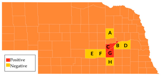 Collection locations in Nebraska of native invertebrates. Counties sampled included A. Boone, B. Polk, C. Merrick, D. Butler, E. Buffalo, F. Hall, G. Hamilton, and H. Clay.