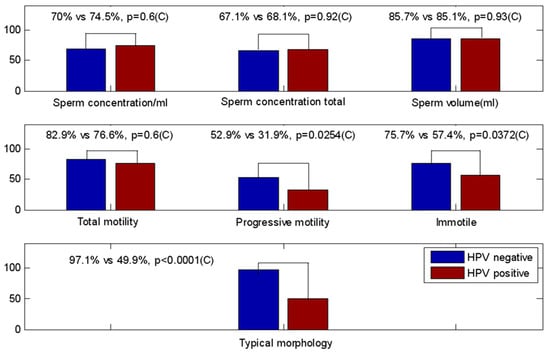 This was an additional statistical analysis performed by comparing not parametric statistical indices, such as means or medians, but the percentages of patients with normal values, according to WHO 2010, between the two groups. This approach better highlighted the differences between seminal parameters and allowed us to point out how HPV-positive patients most frequently have seminal parameters of motility and morphology below the minimum reference limits.