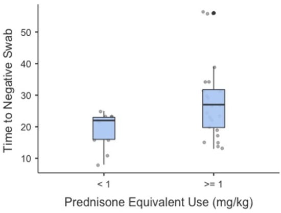 Due to the possible influence on viral clearance, we considered the time to negative swab, finding that prednisone equivalent administration was directly correlated to it. Patients taking a dose of ≥1 mg/kg prednisone showed a longer time to negative swab (p > 0.027) compared to those taking <1 mg/kg (22 vs. 27 days) (Figure 1).