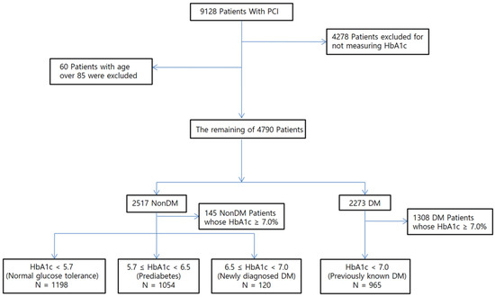 Formation of study population. PCI, percutaneous coronary intervention; HbA1c, glycosylated hemoglobin; DM, diabetes mellitus.