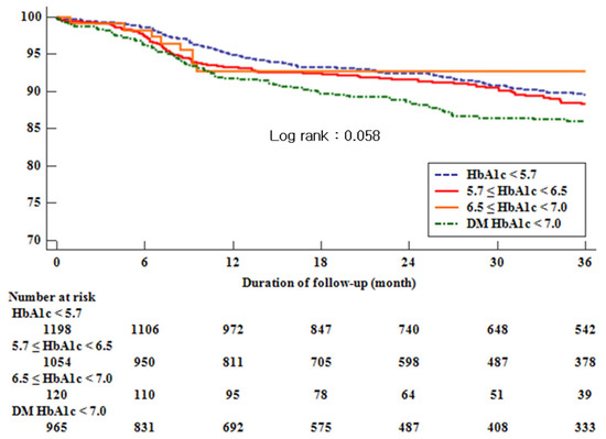 SPSS software version 18.0 (IBM SPSS, Chicago, IL, USA) was used for all statistical analyses. All continuous variables are reported as mean ± standard deviation (SD). Stu-dent’s t-test was used for continuous variables. A chi-square test was used for categorical data. Event-free survival curves were constructed using Kaplan–Meier estimates. They were compared with the log-rank test. Logistic regression analysis was used to identify the relationship between HbA1c and MACE. We also used a Cox proportional hazards model to estimate multivariate-adjusted odds ratios (ORs) for MACE and subtypes of adverse cardiovascular events according to HbA1c values. Statistical significance was accepted when a two-sided p-value was less than 0.05.