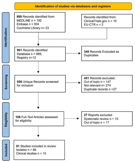 Only clinical studies (randomized controlled trials, cohort studies, and observational studies), published in English with no restrictions on publication date, were included. In vitro studies on isolates were included in the analysis separately. Systematic reviews were analyzed to detect the presence of further papers not included in previous searches.