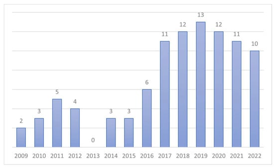 All the selected studies were published between 2009 and 2022, with more than 70% of the works published after 2017. Figure 2 is a visual description of the number of studies per year among the included ones.