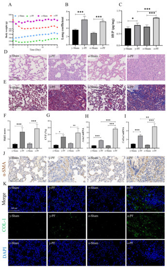 Rats were treated with bleomycin at day 0 and sacrificed on day 14 for analysis of the pathological index. The average body weights of rats in the y-Sham and o-Sham groups increased steadily or remained stable. The average body weight of the y-PF group decreased in the first 3 days after bleomycin treatment and increased from day 4. However, the average body weight of the o-PF group decreased steadily until 14 days (Figure 1A). Lung coefficients are calculated by (lung wight × 1000)/bodyweight, which reflects the degree of pulmonary edema and inflammation. The lung coefficients of rats in the y-PF group were significantly increased compared with those of the y-Sham group (p < 0.001), and the lung coefficients of the o-PF group were also significantly increased compared with those of the o-Sham group (p < 0.001) (Figure 1B). Compared with the y-Sham group, the HYP level, H&E scores, and CVF of the y-PF group were significantly increased (p < 0.05 and p < 0.001). Similarly, the indexes of the o-PF group were significantly increased compared with those in the o-Sham group (p < 0.01 and p < 0.001). In addition, compared with the y-PF group, the HYP level of the o-PF group also increased significantly (p < 0.001) (Figure 1C–G), which indicated that the degree of pulmonary fibrosis in old rats is more serious than that in young rats under the same conditions. Collagen I (COL-1) and α-SMA are biomarkers of many fibrotic diseases. In the present research, the mRNA and protein levels of lung tissues in rats were determined by real-time q-PCR and immunohistofluorescence analysis. The mRNA expression of Collagen I (Col1a1) and α-SMA (Acta2) in the PF groups (y-PF and o-PF) was significantly upregulated compared with the sham groups (y-Sham and o-Sham) (p < 0.001), and compared with the y-PF group, the mRNA expression of Col1a1 and Acta2 was significantly upregulated in the o-PF group (p < 0.01 and p < 0.001) (Figure 1H,I). In addition to the mRNA level, as shown in Figure 1J,K, the expression of α-SMA and COL-1 in the y-PF and o-PF groups was more than that in the y-Sham and o-Sham groups, and the area of biomarker expression in the o-PF group was more than that in the y-PF group. The results shown in Figure 1 demonstrate that the symptoms of pulmonary fibrosis are more severe in old rats than in young rats, indicating that the elderly are more susceptible to pulmonary fibrosis.