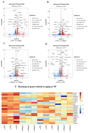 Analysis of differentially expressed genes between different groups. (A) Volcano plot for differentially expressed genes of y-PF vs. y-Sham. (B) Volcano plot for differentially expressed genes of o-PF vs. o-Sham. (C) Volcano plot for differentially expressed genes of o-Sham vs. y-Sham. (D) Volcano plot for differentially expressed genes of o-PF vs. y-PF. (E) Heatmap of genes related to PF and aging.