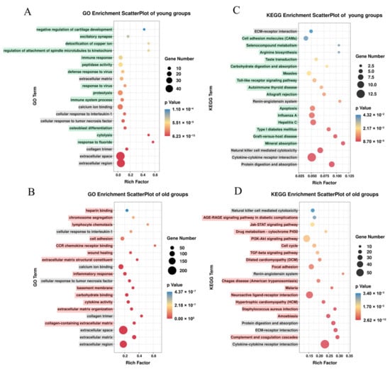 GO and KEGG enrichment analysis between different groups. (A) GO enrichment scatterplot of y-PF vs. y-Sham. (B) GO enrichment scatterplot of o-PF vs. o-Sham. (C) KEGG enrichment scatterplot of y-PF vs. y-Sham. (D) KEGG enrichment scatterplot of o-PF vs. o-Sham. The gray-highlighted terms are enriched both in young and old groups, the green-highlighted terms are only enriched in young groups, the red-highlighted terms are only enriched in old groups.