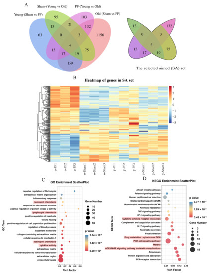 The following supporting information can be downloaded at: https://www.mdpi.com/article/10.3390/life12121961/s1, Table S1: Primer sequences for qPCR assay; Table S2: Heatmap of Figure 3E; Table S3: y-PF vs. y-Sham GO enrichment gene of Figure 3A; Table S4: o-PF vs. o-Sham GO enrichment gene of Figure 3B; Table S5: y-PF vs. y-Sham KEGG enrichment gene of Figure 3C; Table S6: o-PF vs. o-Sham KEGG enrichment gene of Figure 3D; Table S7: Heatmap of Figure 5B; Table S8: SA set GO enrichment gene of Figure 5C; Table S9: SA set KEGG enrichment gene of Figure 5D; Table S10: o-Sham vs y-Sham GO enrichment Gene of Figure S1A.; Table S11: o-Sham vs y-Sham KEGG enrichment Gene of Figure S1B; Table S12: o-PF vs y-PF GO enrichment Gene of Figure S1C; Table S13: o-PF vs y-PF KEGG enrichment Gene of Figure S1D; Figure S1: GO and KEGG enrichment analysis between old and young groups.