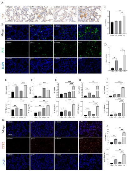 The mRNA and protein expressions of the main indexes related to PF and aging. Representative images (200×) of lung tissue (A) immunohistochemically stained with p53 antibody or (B) immunohistofluorescently stained with p16 antibody. The mRNA expressions of (C) Tp53 (p53) and (D) Cdkn2a (p16) were determined by q-PCR. The mRNA and protein expressions of (E) TGF-β, (F) IL-1β, (G) IL-6, (H) CCL2, (I) CCL7, and (J) CCL12 were determined by q-PCR and ELISA. (K) Representative images (200×) of lung tissue immunohistofluorescently stained with CCR2 antibody. Data are expressed as mean ± SD (n = 3). * p < 0.05, ** p < 0.01, and *** p < 0.001.