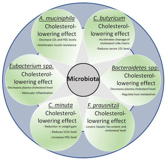 Gut microbiota mediated digestion of complex (non-digestible) carbohydrates and dietary fibers led to the production of different products, particularly SCFAs (abundance of acetate, propionate and butyrate) [93]. Production of butyrate is highest for guar gums, while acetate and propionate were observed in greater proportion for pine fiber and arabinogalactan [94]. Butyrate production was also observed in the fermentation of resistant starch found in food items such as rolled oats and banana flour [94]. A strong correlation was observed between SCFAs and metabolism of lipids; propionate mediated activation of receptor GPCR43 on the intestinal surface and adipose tissue was found effective in reducing lipogenesis that causes reduction in the amount of visceral and liver fat [95,96]. Having higher selectivity for GPCR43 and GPCR41, acetate and butyrate are metabolized for incorporation into fatty acids and cholesterol [56]. Interaction of SCFAs, abundant in acetate, propionate and butyrate, with peroxisome proliferator activated receptors (PPARs, a critical regulator of carbohydrate and lipid metabolism), favoring fatty acids oxidation in tissues such as liver, skeletal muscle, etc., helps in reducing lipid levels [97]. Additionally, gut microbial species, especially Clostridium, Lachnospira, Eubacterium, etc., capable of removing different bile acid groups (hydroxyl, taurine and glycine), yield secondary bile acids for regulating lipid metabolism (both hepatic and systemic) via FXR (bile acid receptor) [98,99,100]. Secondary bile acids interaction with FXR lowers plasma lipid concentration by decreasing serum triglycerides with simultaneous increase in the amount of HDL cholesterol [66,67,101]. Together, implication of FXR inactivation in preventing hepatic steatosis and dyslipidemia decreases the chances of occurrence of CVDs.