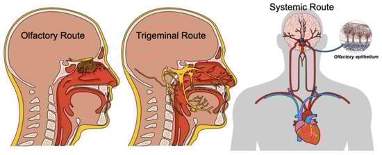 - Johnson, N.J.; Hanson, L.R.; Frey, I.W.H. Trigeminal Pathways Deliver a Low Molecular Weight Drug from the Nose to the Brain and Orofacial Structures. Mol. Pharm. 2010, 7, 884–893. [Google Scholar] [CrossRef] [PubMed]