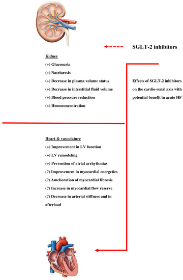 Indeed, SGLT-2 inhibitors are considered a novel diuretic drug class with potential applicability in acute HF [74]. As stated above, SGLT-2 inhibitors exert a number of effects that can be beneficial for patients with acute HF: they induce osmotic diuresis and natriuresis, decrease plasma volume status and interstitial fluid volume, which is expanded in HF, reduce blood pressure, and provoke hemoconcentration. In addition, they were shown to significantly improve LV function, ameliorate LV remodeling and prevent the occurrence of atrial arrhythmias, especially atrial fibrillation and atrial flutter. However, other effects need to be further explored, including improvement in arterial stiffness, myocardial flow reserve and in myocardial energetics.