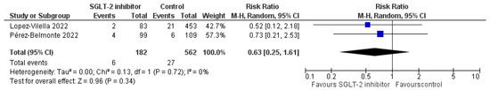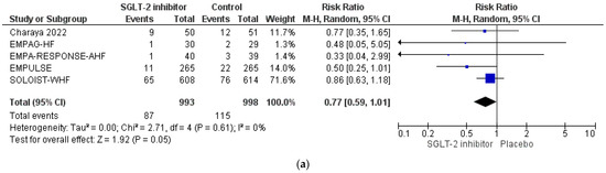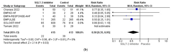 Regarding all-cause mortality, SGLT-2 inhibitor treatment was shown not to affect the risk for all-cause death among subjects hospitalized with acute HF or recently decompensated HF (RR = 0.77, 95% CI; 0.59–1.01, I2 = 0%), as shown in Figure 2a. However, the exclusion of the SOLOIST-WHF trial in order to restrict our analysis to the acute HF setting showed that SGLT-2 inhibitor produce a significant decrease in the risk for all-cause death among individuals with acute HF, equal to 42% (RR = 0.58, 95% CI; 0.35–0.95, I2 = 0%), as shown in Figure 2b.
