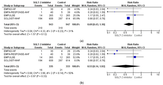 Concerning the risk for worsening HF event, SGLT-2 inhibitor treatment was shown not to affect the corresponding risk among individuals hospitalized with acute or recently decompensated HF (RR = 0.69, 95% CI; 0.43–1.10, I2 = 31%), as shown in Figure 3a. Of note, even in the acute HF setting, after the exclusion of the SOLOIST-WHF trial, no difference in the treatment effect was shown (RR = 0.53, 95% CI; 0.14–1.92, I2 = 50%), as depicted in Figure 3b.