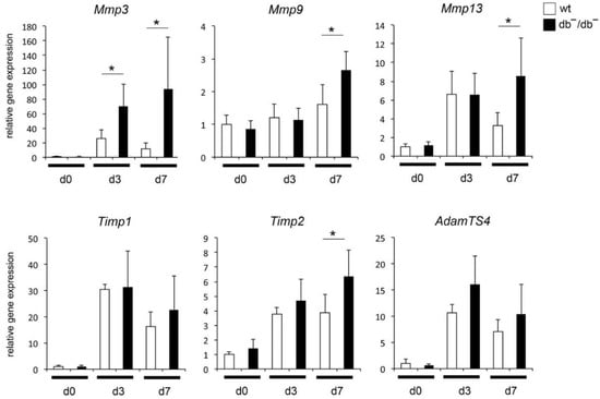 To understand the mechanisms of diminished regeneration of bones in diabetes, activation of distinct pathways in healing bones of wt and db−/db− was examined by microarray analyses. Data revealed noticeable activation of canonical pathways concerning inhibition of MMPs in regenerating wt bones [12]. Several genes related to MMPs were selected in order to analyze gene expression by qRT-PCR in more detail. During bone regeneration, expression of Mmp3 and Mmp13 was significantly elevated in general, whereas up-regulation in bones of db−/db− was significantly higher compared to wt bones (Figure 2). Expression of Mmp9 was not up-regulated in regenerating wt bone, whereas up-regulation in bones of db−/db− was observed seven days (d7) postoperatively. Additionally, expression patterns of MMP inhibitors Timp1, Timp2 and metalloproteinase AdamTS4 were investigated. A significant up-regulation of gene expression of all examined genes was observed in regenerating bones, whereas up-regulation of Timp2 was significantly higher in bone of db−/db− as compared to bone of wt animals seven days (d7) postoperatively (Figure 2).