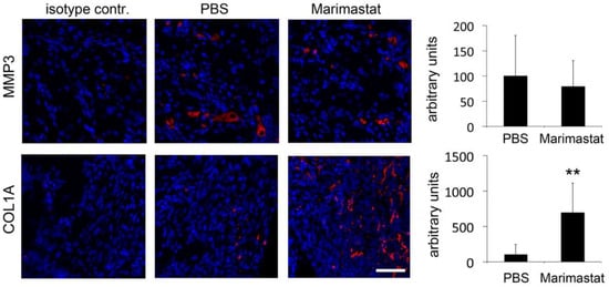 Although most studies show that inhibition of MMPs by Marimastat blocks angiogenesis, there are also studies demonstrating the opposite. Stabilization of microvessels mediated by Marimastat was associated with blockade of collagen lysis and accumulation of collagen fibrils [42]. Similarly, we also observed an increased microvessel density after MMP inhibition seven days postoperatively. Consequently, in order to analyze whether this increase was also associated with inhibition of collagen lysis or accumulation of collagen fibrils, we representatively analyzed the content of MMP3 and COL1A1 after inhibiting ECM degradation activity of MMPs by Marimastat. An alteration in MMP3 level was not detected by immunofluorescent staining. Thus, Marimastat binds the MMP-active site presumably without affecting MMP level or shielding the protein from binding by antibodies during IHC. In contrast, inhibition of broad MMP activity significantly increased COL1A1 content by protecting collagens from lysis.