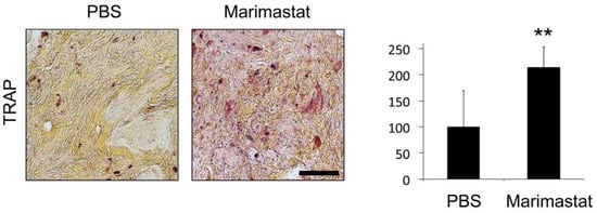 Further experiments showed impaired osteoclast invasion into bone defects of mice with diabetes [10,12,22]. TRAP is highly expressed in osteoclasts and serves as an osteoclastic marker. TRAP-staining revealed increased osteoclast invasion in damaged bone areas of Marimastat-treated db−/db− mice seven days postoperatively (Figure 7). Thus, diminished osteoclast levels rebounded to physiological levels in regenerating bones of mice with diabetes after inhibition of MMP activity by Marimastat.