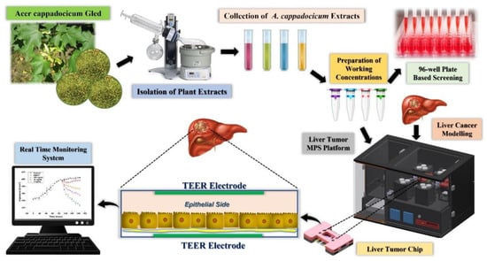 The primary objective of the present study was to utilize a liver tumor MPS for testing the anticancer activities of plant extracts and their comparison with the traditional cell culture model. The anticancer activity of methanolic extracts of Acer cappadocicum Gled was tested against the liver tumor MPS composed of hepatocellular carcinoma cells. Various concentrations of the methanolic extracts of Acer cappadocicum Gled were perfused through the cell culture media. A chip-embedded TEER sensor was applied to evaluate the impact of the plant extracts on the cell–cell tight junctions. The study was also translated with a traditional in vitro cell model (96-well cell culture plate), and a considerable difference among the anticancer activities was noted by measuring various biomarkers.