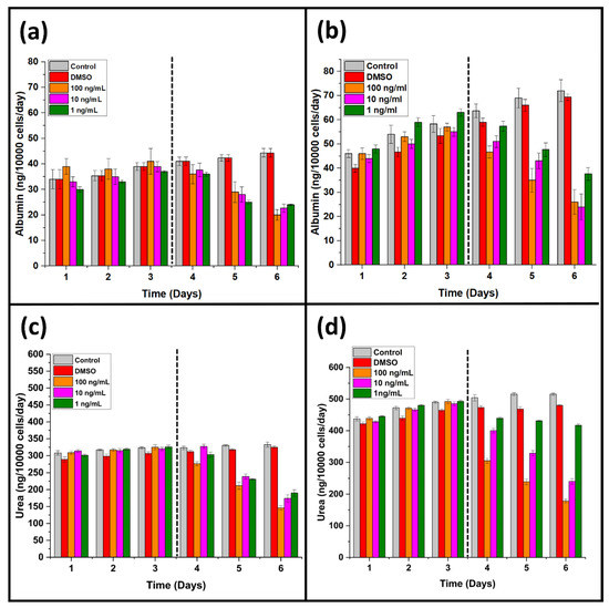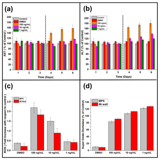 Liver function tests, such as albumin, urea, ALT, and AST, are the set of biomarkers representing the overall pathophysiological state of the liver-specific cells. Hepatocellular carcinoma cells continuously produce liver-specific proteins and other biomarkers, which can be utilized to monitor the effect of an anticancer agent [29,30]. MPS is known to influence the yield of albumin by HepG2 cells greatly. Comparing the conventional cell culture model (96-well cell culture plate), liver tumor MPS showed a considerable difference in albumin release between the two cell culture models [10,31]. The albumin production by liver tumor MPS was onefold increased compared to the conventional cell culture model (Figure 2a,b). A similar response was observed in the case of urea release by the liver tumor MPS shown in Figure 2b,c.