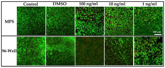 Live/dead assay confocal images on liver tumor MPS and 96-well cell culture plates without any treatment (control), DMSO, and after treatment with plant extracts (100 ng mL−1, 10 ng mL−1, 1 ng mL−1). Results exhibit the cell viability after 72 h of incubation at 37 °C. Scale bars represent 200 µm.