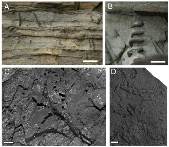 - Bromley, R.G. Trace Fossils. Biology, Taphonomy and Applications, 2nd ed.; Chapman & Hall: London, UK, 1996; pp. 1–361. [Google Scholar]