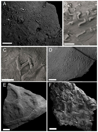 - Uchman, A.; Bromley, R.G.; Leszczynski, S. Ichnogenus Treptichnus in Eocene flysch, Carpathians, Poland: Taxonomy and preservation. Hist. Biol. 1998, 5, 269–275. [Google Scholar]