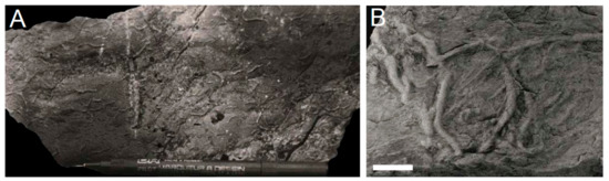 - Fuchs, T. Studien über Fucoiden und Hieroglyphen. Denkshriften der Kaiserlichen Akademie der Wissenshaften, Matematisch Naturwissenschaftliche Klasse; Aus der Kaiserlich-Königlichen Hof- und Staatsdruckerei: Wien, Austria, 1895; Volume 62, pp. 369–448. [Google Scholar]
