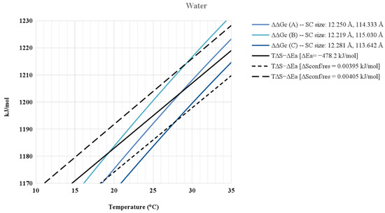 Since ΔGtr[T(collapse)] = 0, T(collapse) = 28.5 °C in water, and ΔΔGc(water) = 1203.4 kJ mol−1 at 28.5 °C, it is possible to take advantage of this constraint via Equation (4) and of the T·ΔSconf estimate reported above, fixing: