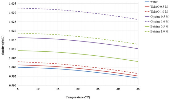 Experimental density of water and 0.5 and 1.0 M TMAO, 0.5 and 1.0 M betaine, 0.5 and 1.0 M glycine aqueous solutions over the 5–35 °C temperature range at 1 atm.