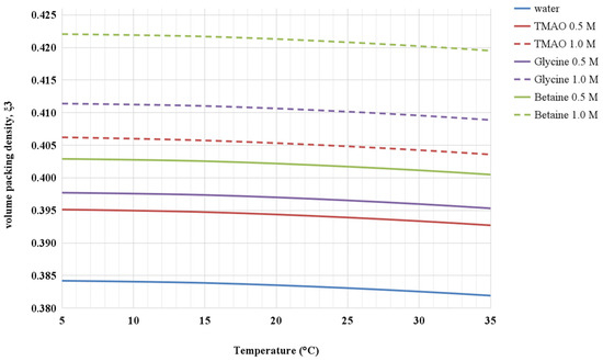 Values of the volume packing density, ξ3, for water and for 0.5 and 1.0 M TMAO, 0.5 and 1.0 M betaine, 0.5 and 1.0 M glycine aqueous solutions over the 5–35 °C temperature range at 1 atm.